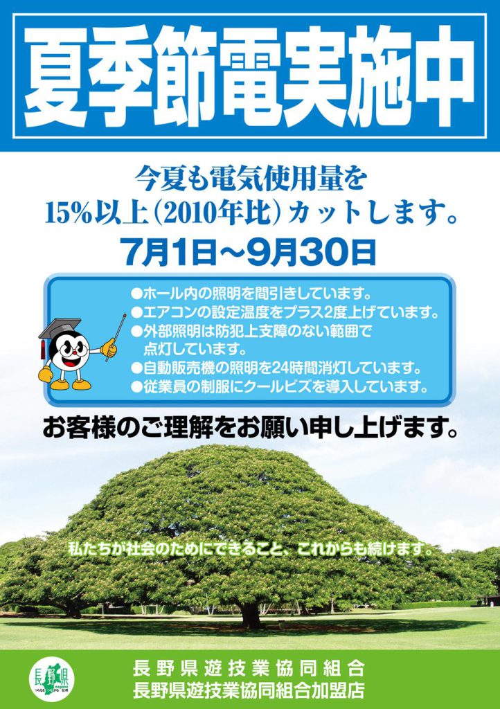 ☆7月1日より3ヶ月間「夏季節電対策」に組合統一して取り組みますので、ご理解とご協力のほど、宜しくお願いします。